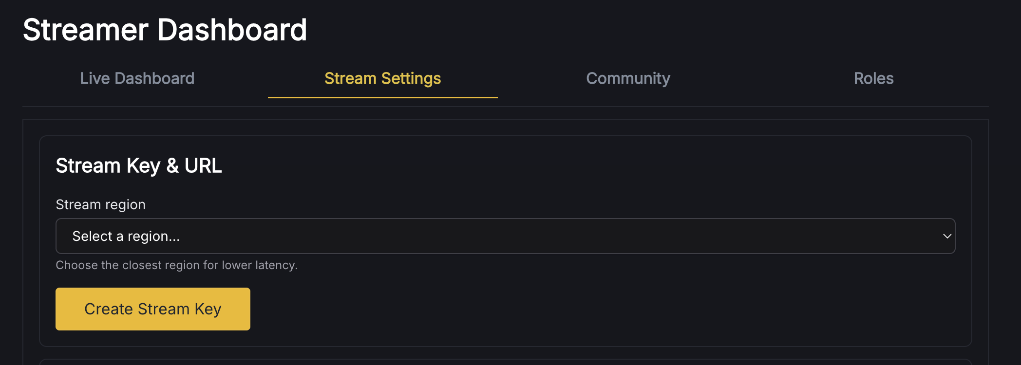 Go to your Streamer Dashboard → Stream Settings → Create Stream Key and pick the region closest to you.
