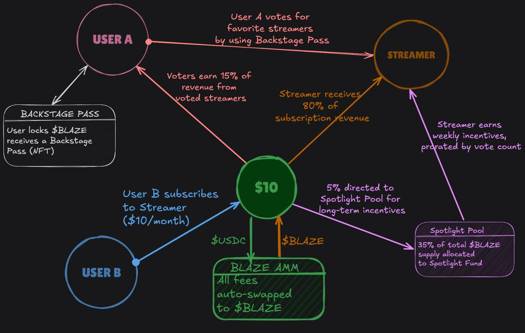 Blaze gives users a Backstage Pass and a button that matters. When you press it, something moves: light hits the right streamer, value flows their way, and you, the voter who showed up, get a Supporter Split from that channel. Simple. Visible. Loud.