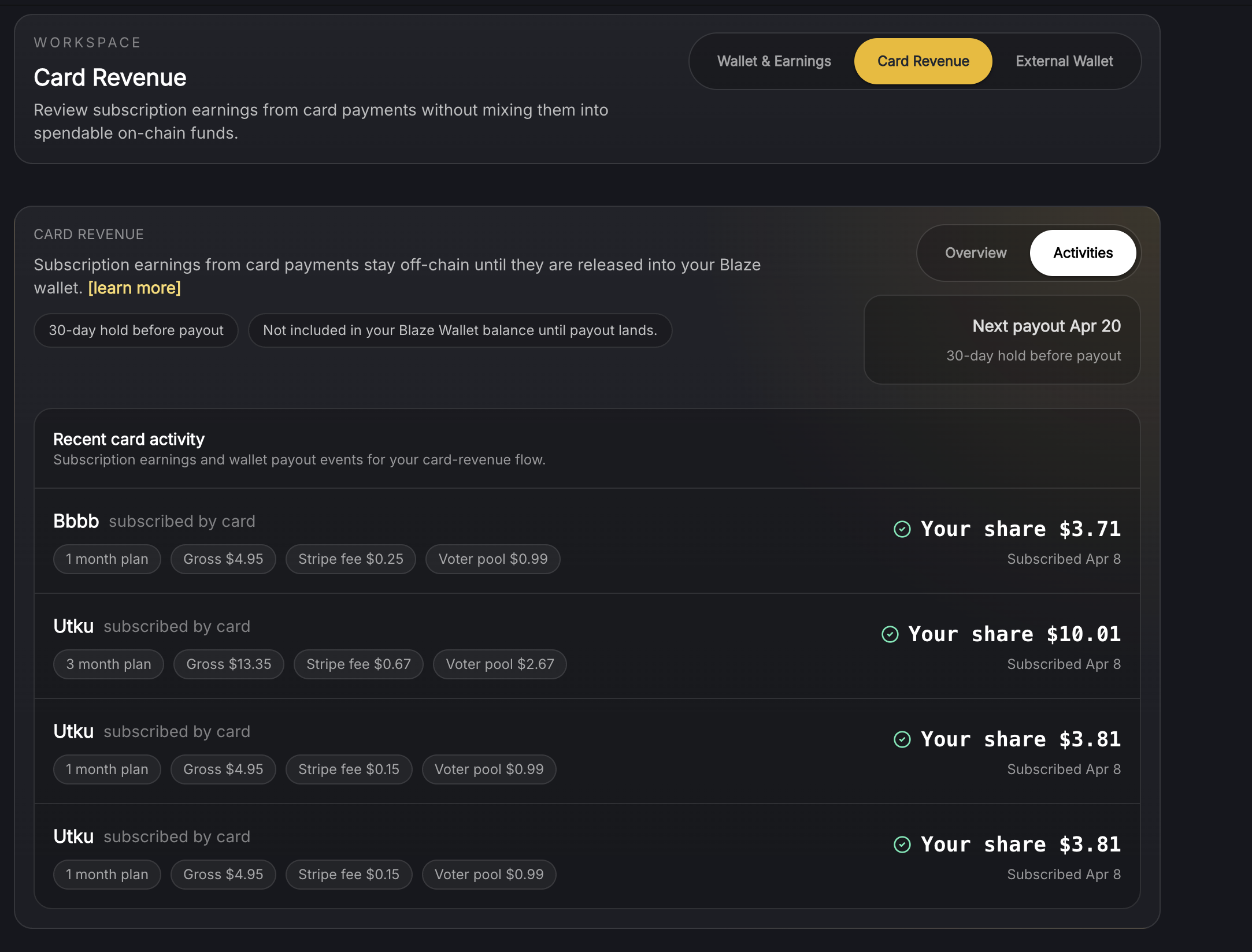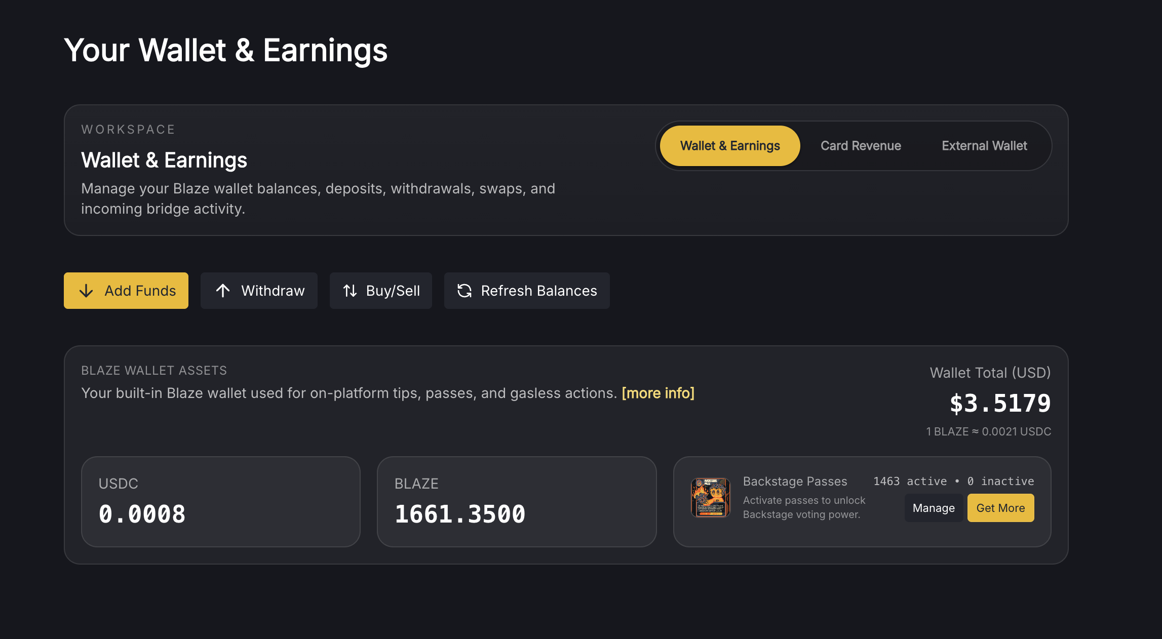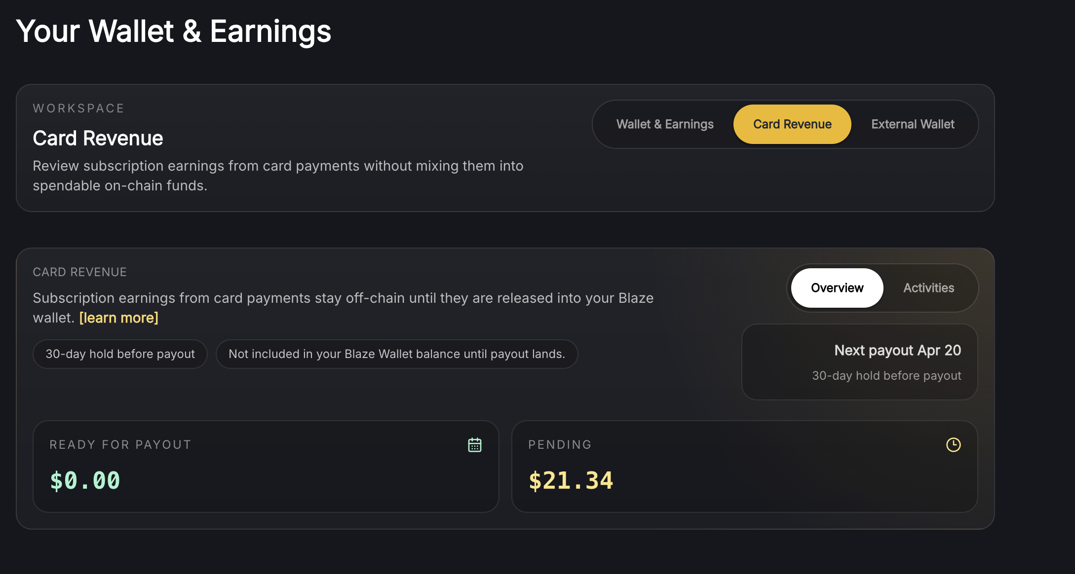 Blaze now supports credit card subscriptions, and with that, we’ve redesigned the Wallet into a more structured Wallet & Earnings experience.
